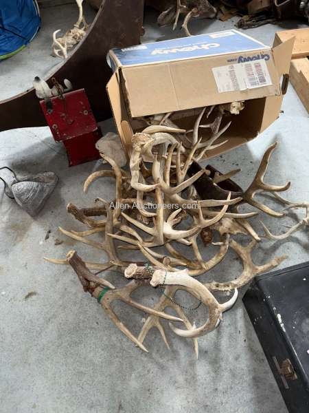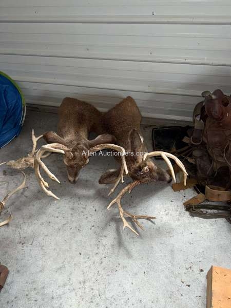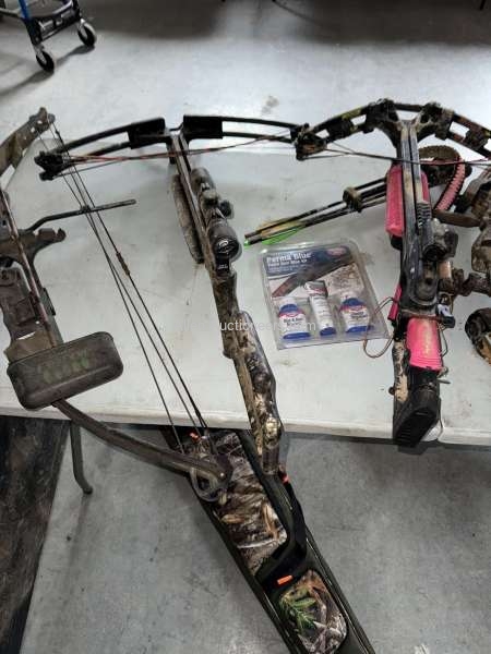 Crossbows, Compound bows, Fishing tackle, Rods and Reels, Multiple Deer mounts, antlers, Lots of Ammo, Wooden Fish Trap, Tree Stands